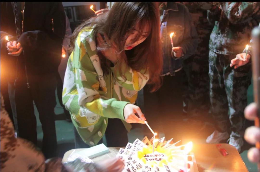 辅导员老师和带班们为萌新们准备了生日蛋糕,为他们带上了生日帽,点燃蜡烛唱起生日歌。