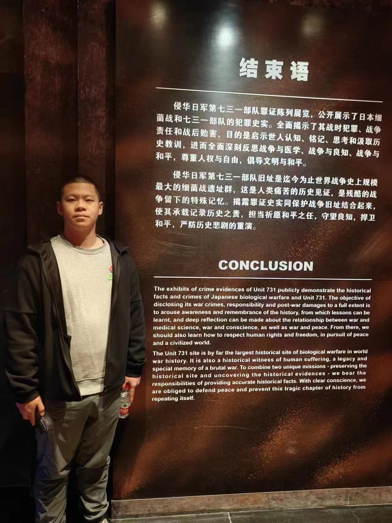 上午9时,党员们来到731部队罪证陈列馆。在这里,展览分7个主题,从731部队的组成到细菌战再到惨无人道的人体实验,详细讲述了这段沉痛的历史,展出了大量的历史图片、文献资料和历史文物等。党员们深入了解731部队的罪恶历史和其给人民带来的沉重苦难,感受到了历史的残酷和疼痛。我们作为中共青年党员应更加深刻地认识到不能忘记侵略者们犯下的罪行,同时也要时刻自省,端正思想,做一名有理想抱负的为国效力的出色的共产党员。