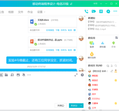在教学手段上,使用“腾讯会议+QQ家校师生群+超星学习通”的方式开展教学活动。使用腾讯会议开展直播教学,与员工进行互动,员工可以在讨论区进行留言提问并与教师连麦进行语音互动,如图1所示。使用QQ群进行课程资源的分享,并进行课程通知,如图2所示。使用超星学习通进行实验报告的发布和批改,并设置题库进行理论考试,如图3所示。